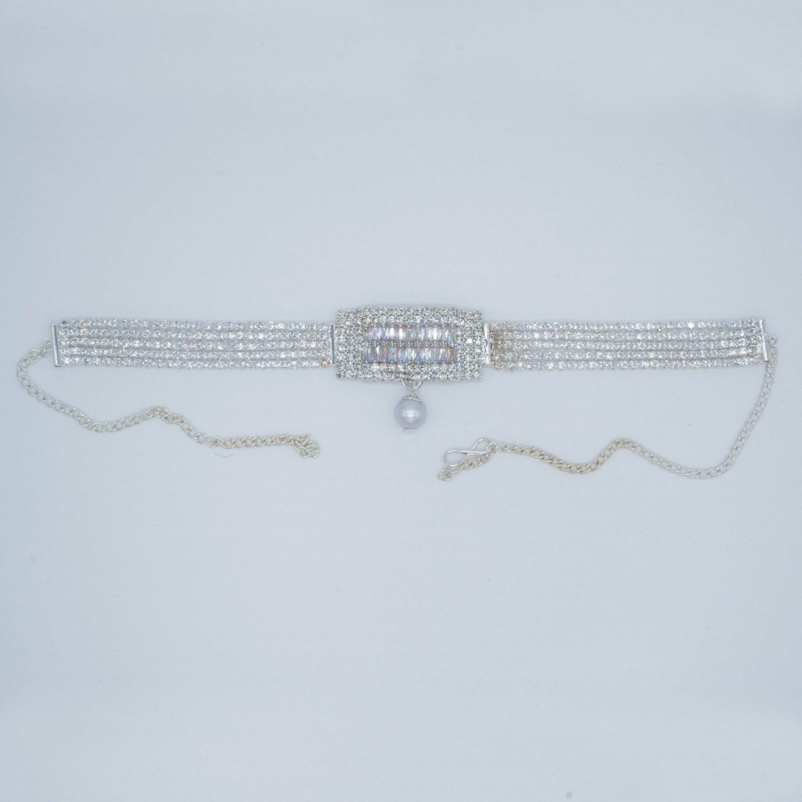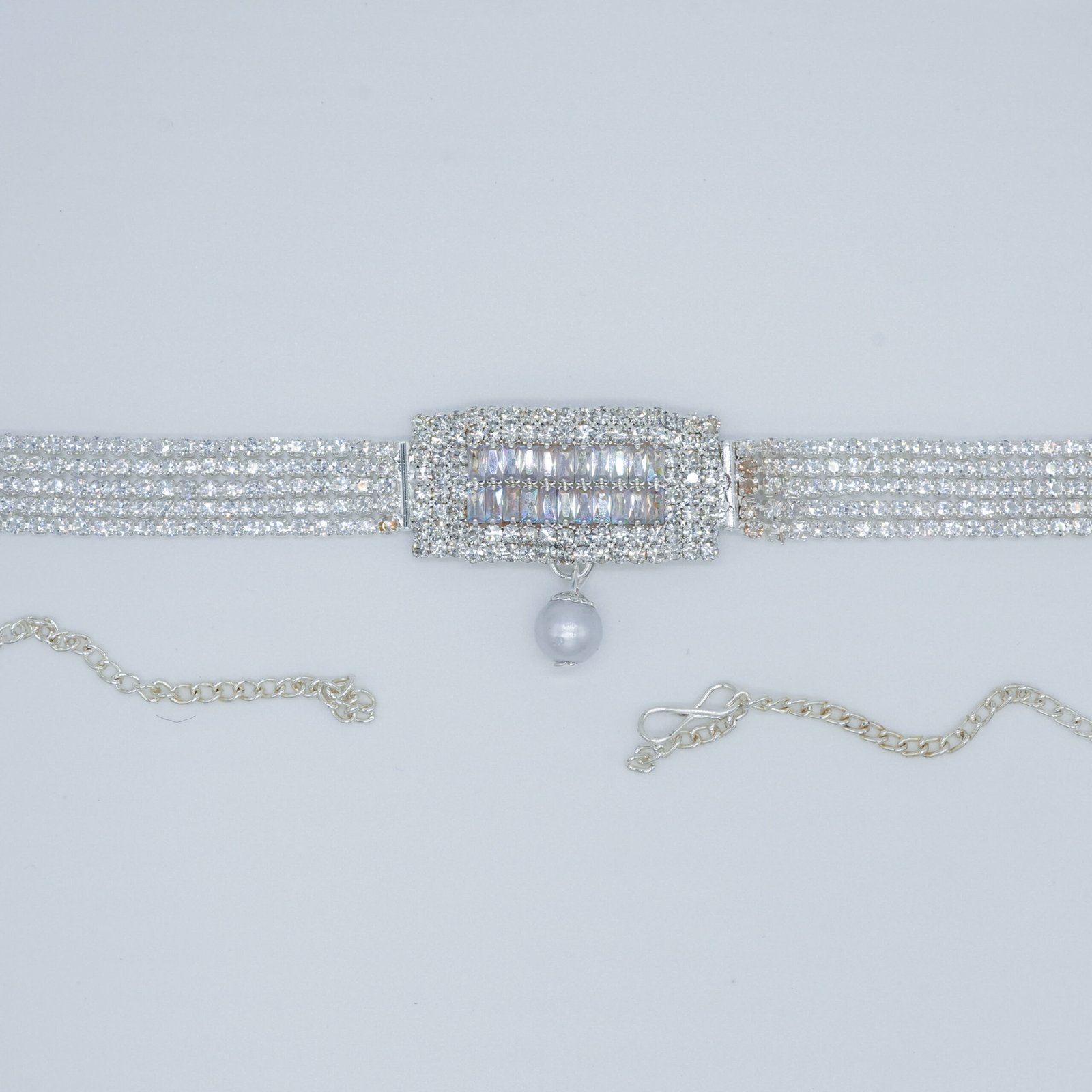 Elegant silver-tone choker featuring a rectangular centerpiece adorned with brilliant, multi-row cubic zirconia stones. A single, delicate pearl drop dangles from the center, adding a touch of classic sophistication. The multi-strand band is also encrusted with sparkling cubic zirconia, creating a dazzling and luxurious look. This piece is perfect for special occasions, adding a radiant and glamorous touch to any outfit.