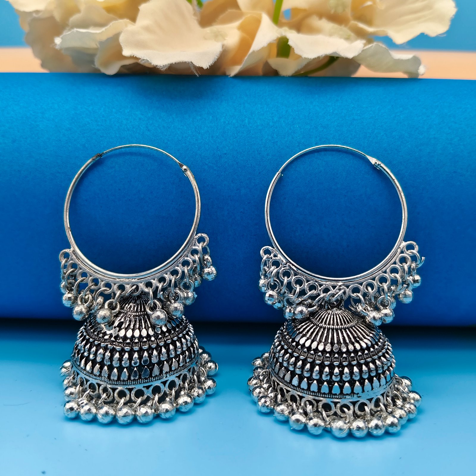 A striking pair of oversized Jhumka hoop earrings in an oxidized silver-tone (German Silver) finish. The design features a large, simple hoop attached to an ornate, inverted bell-shaped Jhumka. The bell is heavily detailed with textured metalwork, beading, and decorative etchings. The hoop is also partially embellished with dangling silver ghungroos (small metal beads/bells), and the bottom fringe of the Jhumka is densely adorned with more ghungroos, giving the earrings a substantial weight and creating beautiful movement and a soft, rustic jingle