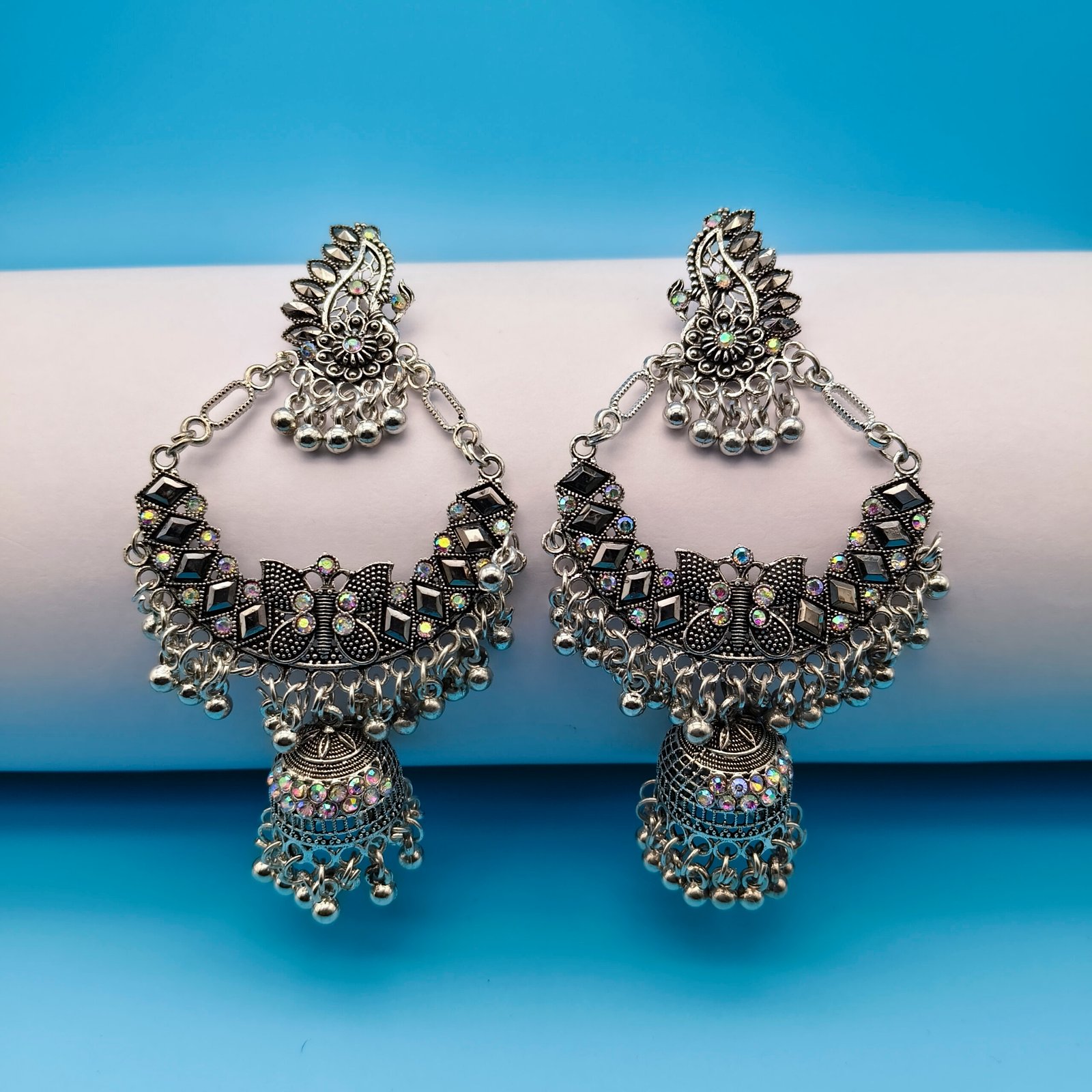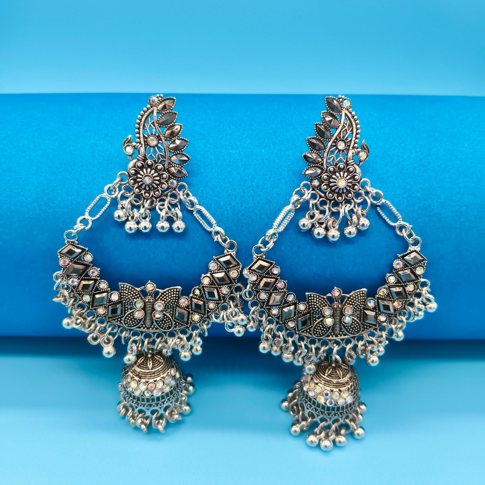 “A magnificent pair of oxidized silver jhumka earrings with intricate detailing. The design features a delicate floral stud top, from which a large, crescent-shaped, open-work body descends. This middle section showcases a striking butterfly motif adorned with sparkling, multi-colored (iridescent) stones. The earrings are finished with classic, domed jhumka bells covered in numerous small silver ghungroo (beads). The overall look is a blend of traditional Indian craftsmanship and bold, Bohemian style.”