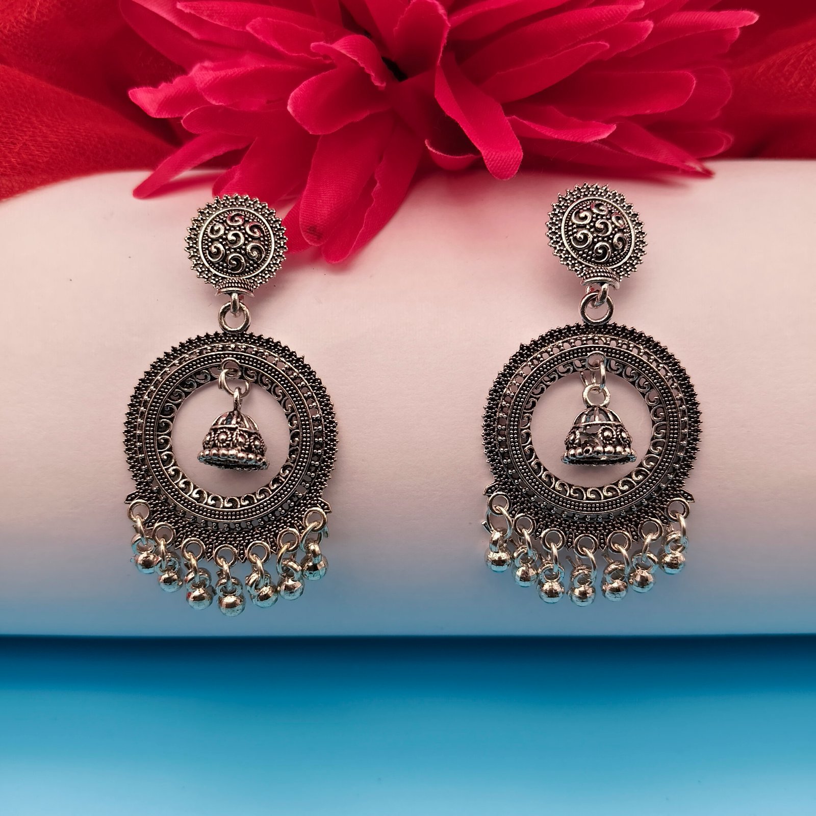 These stunning oxidized silver jhumka earrings are a beautiful blend of traditional and contemporary style. They feature a detailed, circular filigree design, housing a dangling miniature jhumka bell at the center. The top stud has an intricate floral or mandala pattern, and the bottom is finished with delicate tiers of small, swinging silver beads that add movement and a lovely chime. Their antique finish gives them a distinct, ethnic appeal perfect for pairing with traditional Indian wear like sarees and lehengas, or adding a bohemian flair to Western outfits