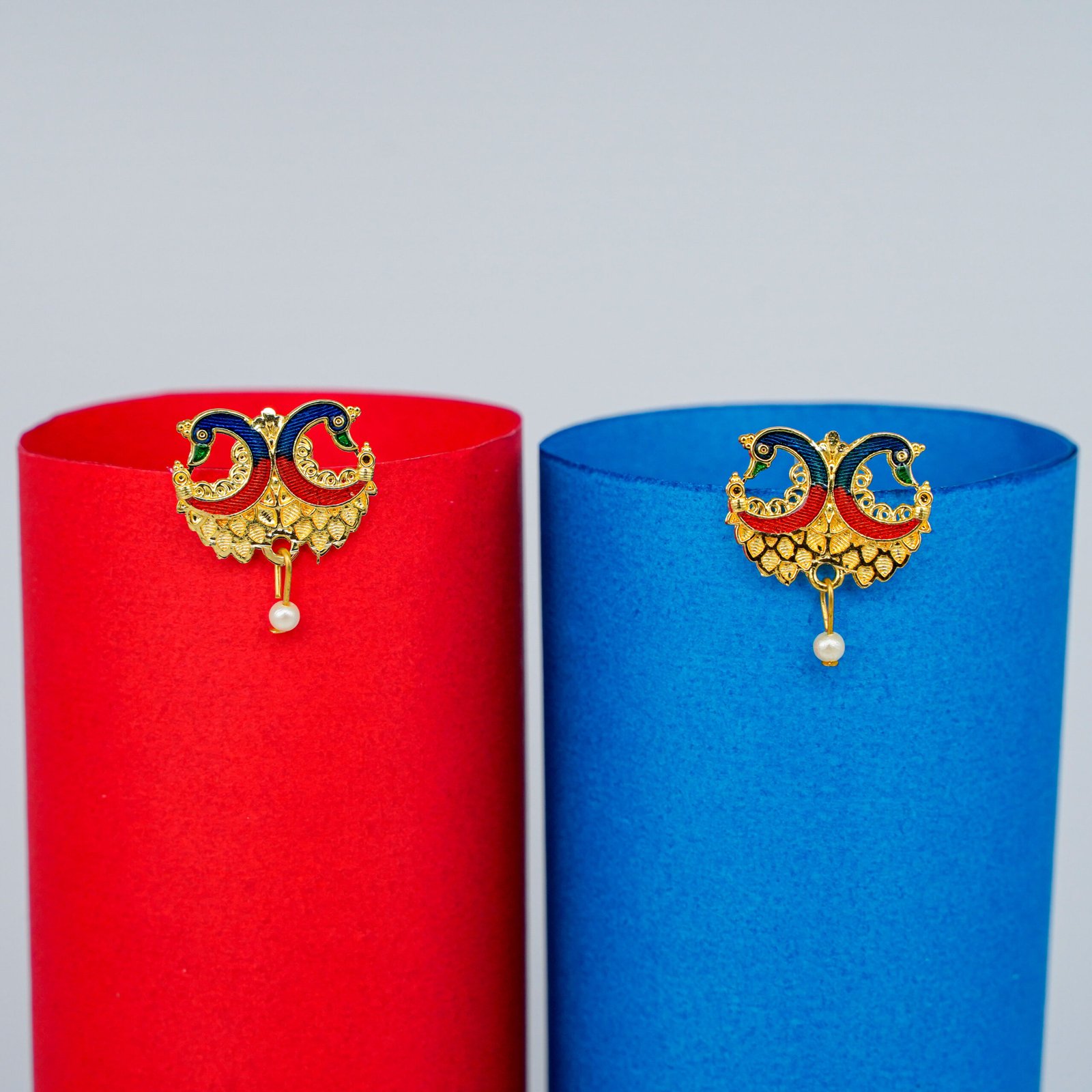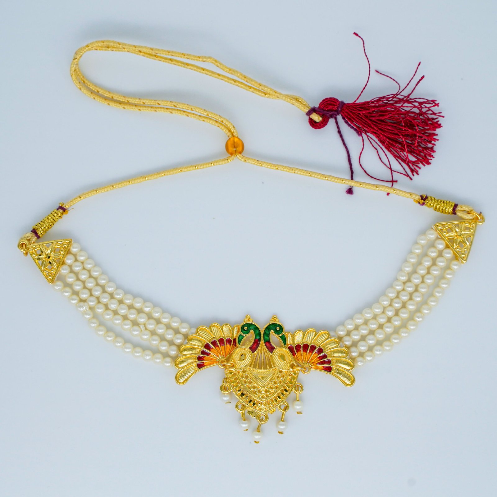 An exquisite traditional Indian choker necklace featuring a striking dual peacock motif centerpiece. The centerpiece is made of gold-tone metal with fine detail and is beautifully accented with colorful meenakari (enamel) work in green and red. The collar itself is formed by multiple strands of creamy white faux pearls. It is secured with a traditional adjustable dori (cord) ending in a red tassel